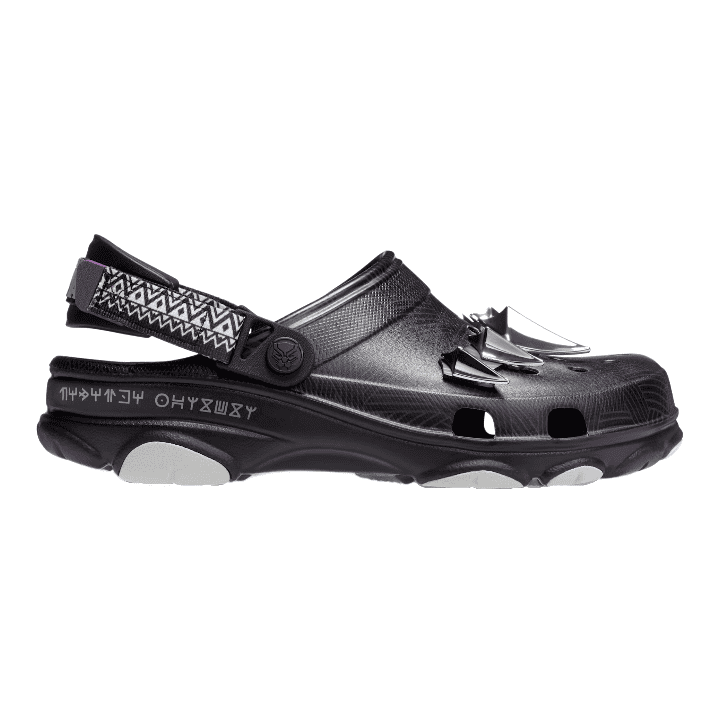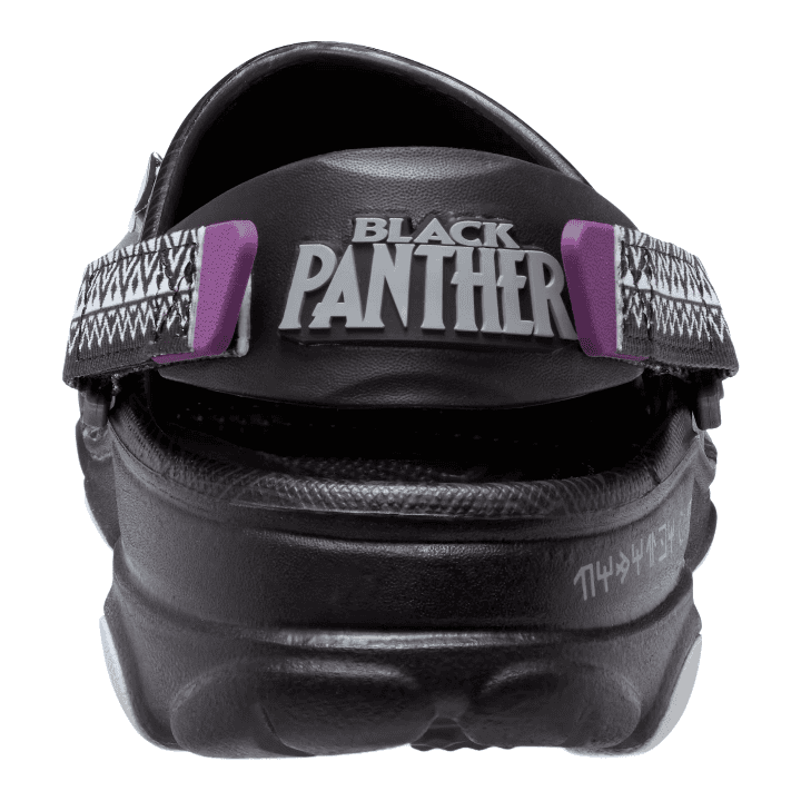 Sport your Wakanda Forever style in the Classic All-Terrain Black Panther Clog that is set to take you on any adventure. The oversized Jibbitzâ„¢ charms pay tribute to the new film and adjustable backstraps keep you secure no matter where you venture. This rugged style will take the throne as your new favorite pair.
