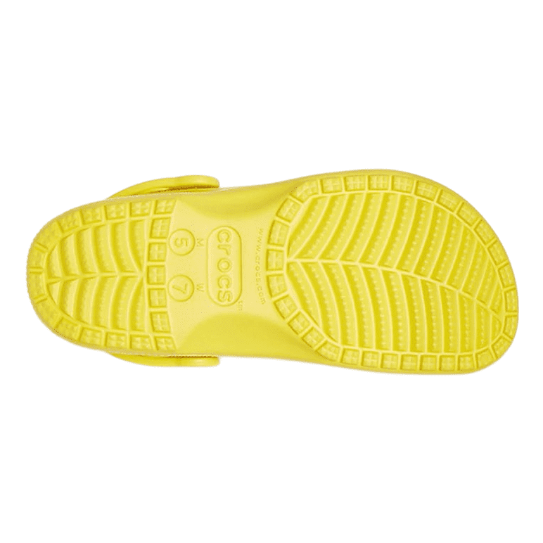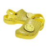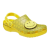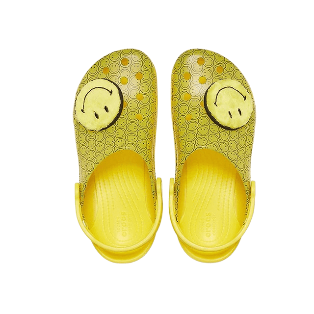 Coloured in bright yellow, the translucent uppers are embellished with multiple smiley faces and two large fuzzy smiley Jibbitz™